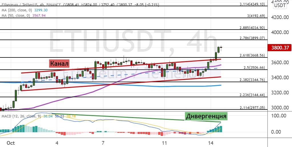 Котировки эфира вышли за рамки границ модели теханализа «Канал» (показана на графике ниже бирюзовым цветом), что позволило им устремиться к $3 670 и $3 800. Если эфиру в краткосрочной перспективе удастся закрепиться выше $3 800, это позволит ETH направиться к следующим целям на $3 900 и $4 000.