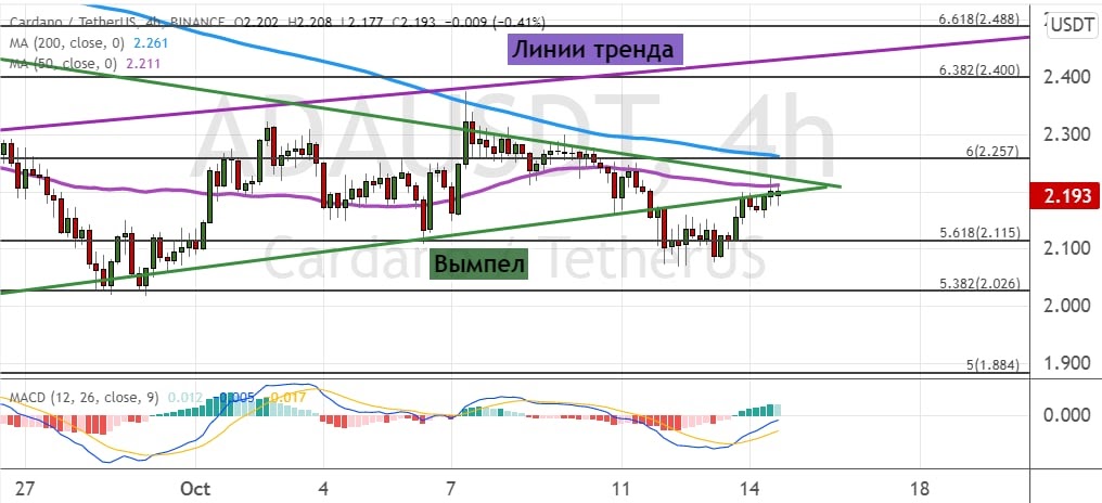 В последние дни котировки ADA двигаются вдоль нижней границы модели теханализа «Вымпел» (показана на графике ниже зеленым цветом). Если им удастся подняться выше сопротивления $2.25, где проходят линии 50-периодной и 200-периодной SMA, это откроет путь к росту до уровней $2.4 и $2.5. В районе последней также проходит линия тренда (показана фиолетовым цветом). Среднесрочными целями выступают уровни $2.63 и $2.7.