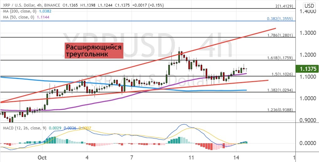 В последние дни XRP торгуется в рамках кластера уровней $1.10–$1.18, а котировки альткоина двигаются внутри модели теханализа «Расширяющийся треугольник» (показана на графике ниже бордовым цветом).