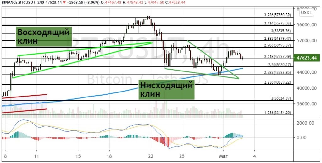 Однако если биткоину не удастся закрепиться выше этого уровня, то его котировки уйдут в нисходящее движение. При этом уход ниже уровня поддержки на $47 337 позволит активу вновь протестировать цели на $45 330 и $43 320. Прорыв этих уровней представляется вполне реалистичным сценарием, что поможет котировкам BTC направиться к поддержкам на области $40 000–$40 840 и к минимумам на уровнях $36 800 и $33 200.
