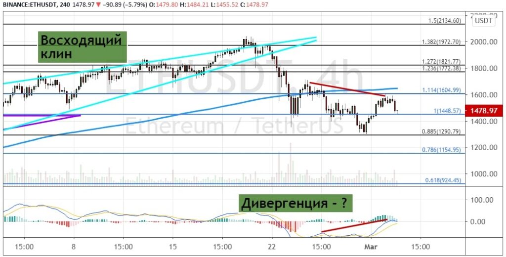 Однако в краткосрочной перспективе котировки ETH могут пойти в нисходящее движение. Подтверждением этого сценария станет пробитие границ области $1 400–$1 450. В таком случае ETH продолжит движение к поддержкам на уровне $1 290 и к границам области $1 150–$1 200 и даже к $920–$1 000. В пользу реализации этого сценария указывает медвежья дивергенция между ценой на графике и MACD. Однако надо понимать, что от этих уровней киты также будут готовы начинать выкупать подешевевшую криптовалюту. А это запустит новую волну роста стоимости эфира.