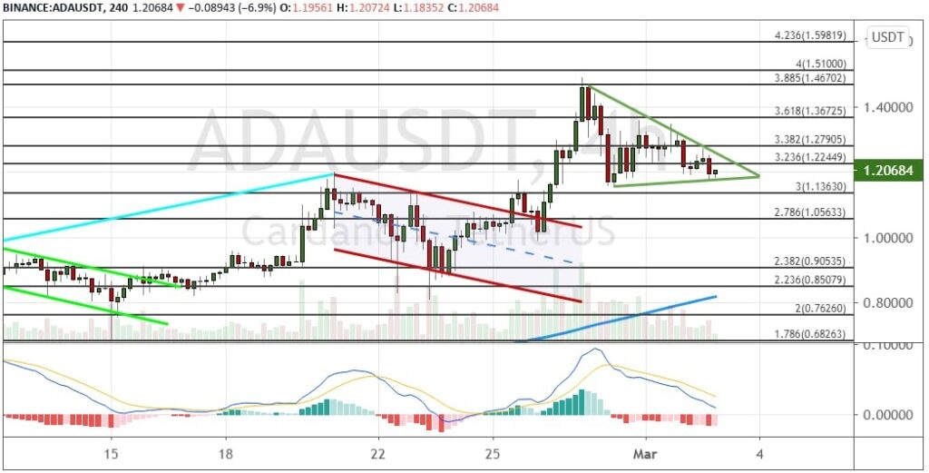 ADA сохраняет третью позицию в рейтинге криптовалют по капитализации даже несмотря на кратковременное снижение, в ходе которого актив опустился обратно к протестированным на прошлой неделе поддержкам на уровнях $1.2250 и $1.2790. Эти линии выступают теперь сопротивлениями.