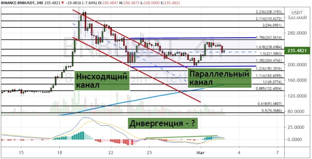 Binance Coin в последние дни развивает боковую динамику в рамках модели теханализа «Параллельный канал». После отскока от поддержек на уровнях $220 и $200 котировки BNB устремились к первым целям $240 и $263 (61.8% и 78.6% расширения по уровням пропорции Фибоначчи). Уровень $263 выступает текущим сопротивлением, и в случае закрытия нескольких свеч выше него можно ожидать роста котировок к целям $280, $300, $310, $328 и $350.