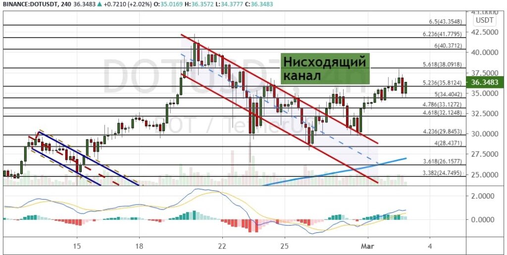 DOT, в отличие от других топовых криптовалют по капитализации, демонстрирует достаточно уверенную растущую динамику. Это произошло после того, как котировки DOT преодолели сопротивления на уровнях $34.40 и $35.80, которые теперь выступают первыми поддержками.
