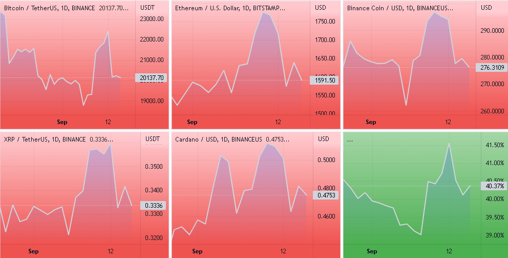 Динамика котировок BTC, ETH, BNB, ADA, XRP (дневной таймфрейм) и график доминации биткоина. Источник