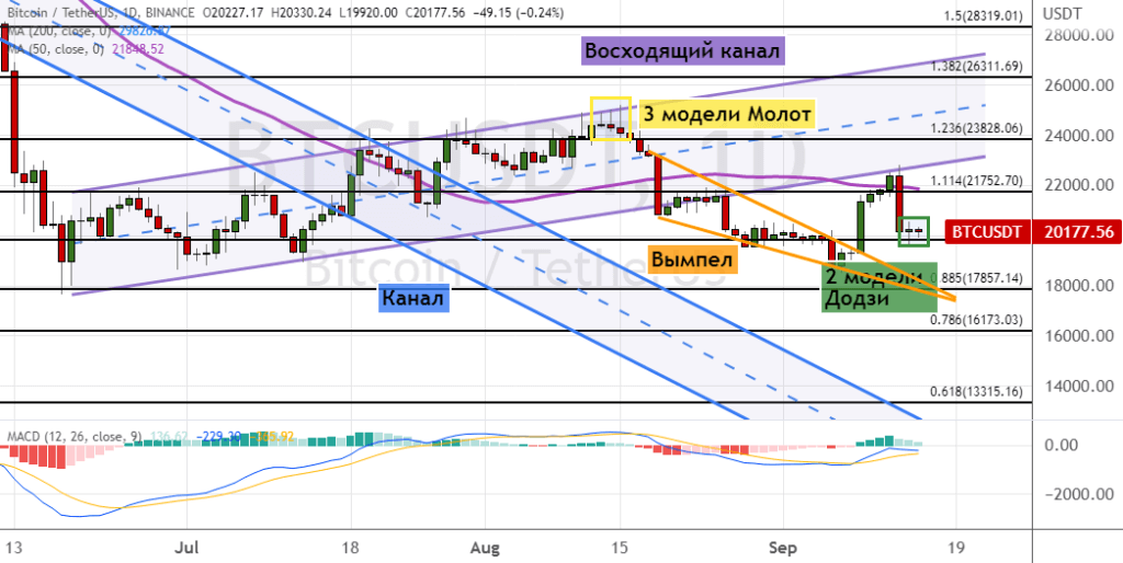 Но если быкам удастся закрепиться выше сопротивлений $21 800 и $23 800, это будет сигналом о восстановлении краткосрочного восходящего тренда. В таком случае стоимость биткоина поднимется до уровней $25 000 и $26 300. В пользу этого прогноза указывают два сигнала теханализа: прорыв верхних границ моделей «Вымпел» и «Нисходящий канал». Также в пользу бычьей динамики может указывать вероятное формирование двух моделей «Додзи» (обозначены зеленым цветом).