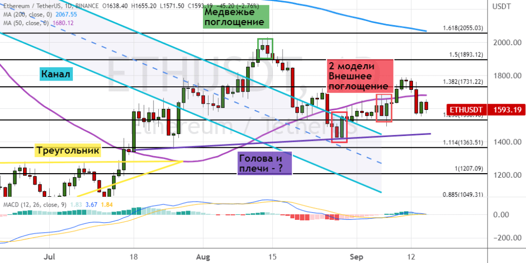 Дальше медведи направят котировки ETH к целям на уровнях $1 363 и $1 300. Более глубокая коррекция обвалит ETH до уровня $1 200. В пользу развития этого сценария торгов указывает вероятно формирующаяся модель теханализа «Голова и плечи» (отмечена фиолетовым цветом) и модель «Медвежье поглощение».