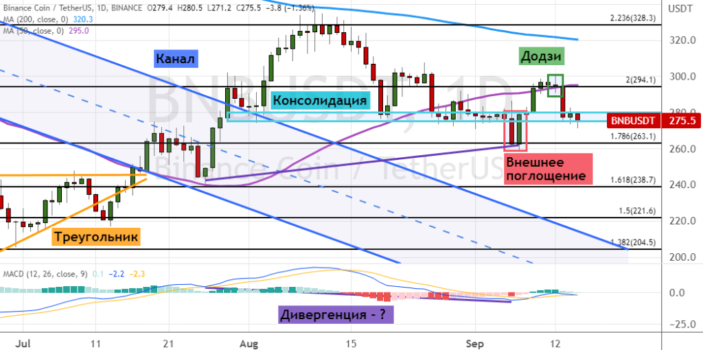 Закрытие дневных свечей выше уровня границ консолидации $295–$300, внутри которой проходит линия 50-дневной SMA, приведет к восстановлению бычьей динамики. Она направит котировки альткоина к первой цели, расположенной в районе границ кластера $320–$330, между которыми также проходит линия 200-дневной SMA. Сохранение восходящего тренда позволит котировкам BNB продолжить рост до уровней $340, $350 и $366. В пользу реализации этого прогноза указывают сигналы в виде пробития верхней границы модели «Нисходящий канал» (обозначена синим цветом) и верхней границы модели «Треугольник», а также формирование модели теханализа «Внешнее поглощение» (обозначена розовым цветом) и дивергенция между ценой на графике и осцилляторе MACD.