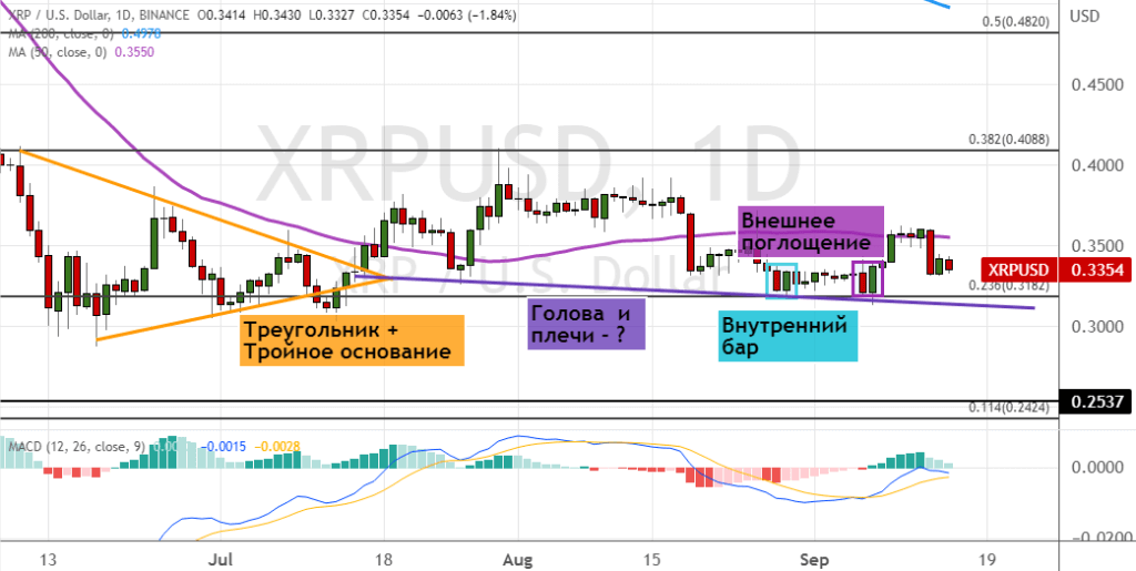 Текущие котировки XRP продолжают консолидироваться ниже уровня сопротивления $0.36, где также проходит линия 50-дневной SMA.