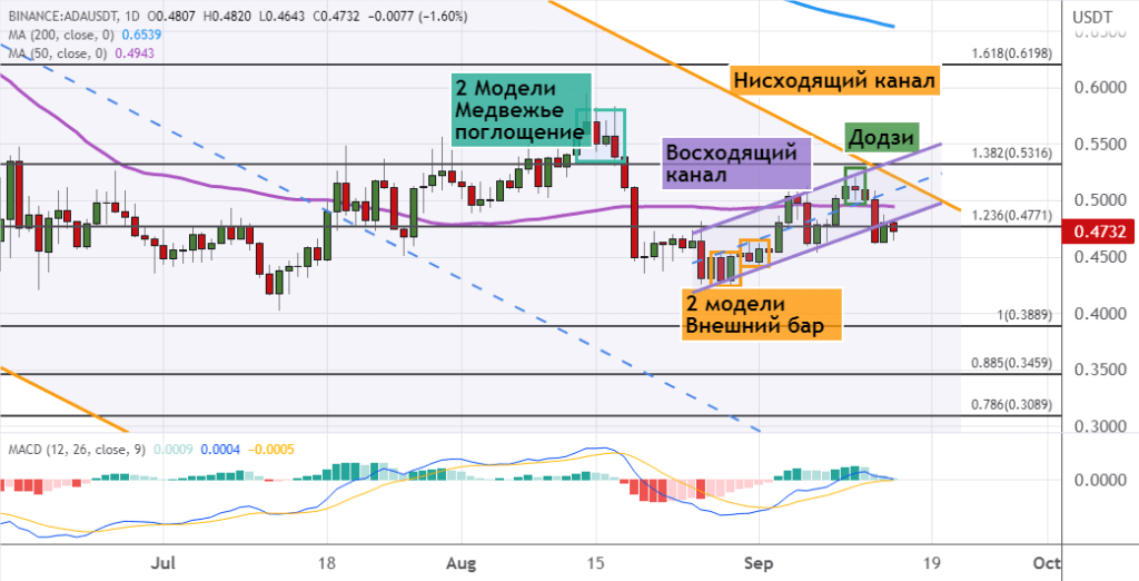 Криптовалюта ADA продолжает консолидироваться между уровнем поддержки $0.45 и сопротивлением $0.5, где также проходит линия 50-дневной SMA.