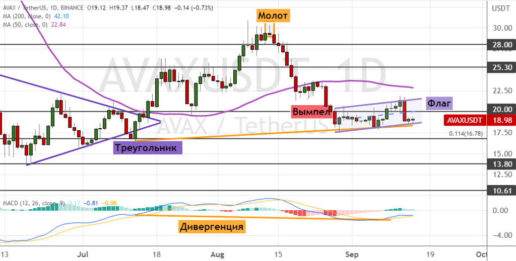 Пробитие текущего уровня поддержки станет сигналом о продолжении нисходящей коррекции. Она позволит медведям продавить котировки альткоина до уровня $17. Более глубокая коррекция приведет к падению стоимости AVAX до уровней $15 и $13.80. В пользу реализации этого сценария торгов указывает модель «Молот» (отмечена оранжевым цветом) и вероятное преодоление нижней границы модели «Флаг» (обозначена светло-фиолетовым цветом).