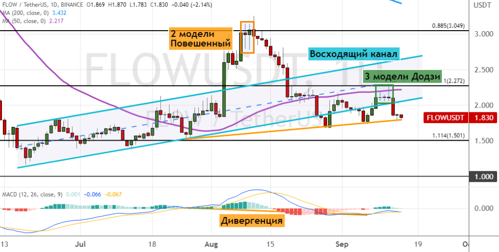 Но в случае падения котировок FLOW ниже границ консолидации $1.7–$2, в районе которых также проходит нижняя линия модели «Восходящий канал», медвежья динамика направит альткоин к поддержке $1.6. Более глубокая коррекция приведет к снижению стоимости FLOW до границ консолидации $1.2–$1.5. В пользу развития краткосрочной нисходящей динамики указывают две модели теханализа «Повешенный» (обозначены оранжевым цветом). Также в пользу снижения могут указывать вероятно формирующиеся три модели «Додзи» (обозначены зеленым цветом) и преодоление нижней границы «Восходящего канала».