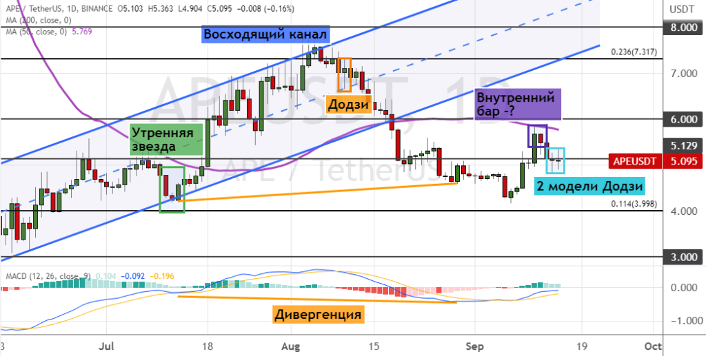 При этом сигналом о восстановлении бычьей динамики станет рост котировок APE выше уровней $6.5 и $7.3. В таком случае быки будут готовы протестировать первые цели — $8, где также проходит верхняя граница модели теханализа «Восходящий канал» (обозначена синим цветом), и $9.2. В перспективе закрытие дневных свечей выше этих уровней приведет к развитию среднесрочного восходящего тренда. Он позволит котировкам токена направиться к уровням $10 и $11.3. В пользу реализации такого прогноза указывает возможное формирование двух моделей «Додзи» (обозначены бирюзовыми линиями) и сохранение актуальности сигналов теханализа в виде модели «Утренняя звезда» и бычьей дивергенции между ценой на графике и осцилляторе MACD.