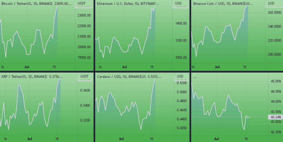 Динамика котировок BTC, ETH, BNB, SOL, XRP (дневной таймфрейм) и график доминации биткоина. Источник