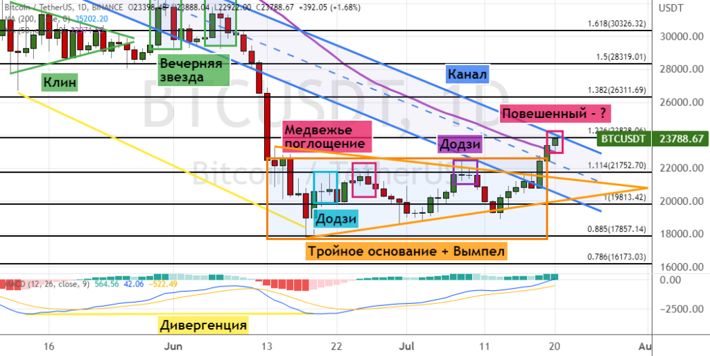 Текущими поддержками для котировок первой криптовалюты выступают уровни $23 000, где также проходит линия 50-дневной простой скользящей средней (SMA), и $21 800. Закрытие дневных свечей ниже уровней поддержки $21 500 и $20 000 приведет к восстановлению медвежьей динамики. Первыми целями здесь выступают уровни $19 000 и $17 800. В пользу реализации этого прогноза все еще указывают такие сигналы, как модели теханализа «Медвежье поглощение», «Додзи» (обозначены линиями фиолетового и бирюзового цвета) и «Клин», а также пробитие нижних границ «Восходящего канала», «Флага» (линии оранжевого цвета) и две свечные комбинации «Вечерняя звезда». Также на графике может формироваться модель «Повешенный».