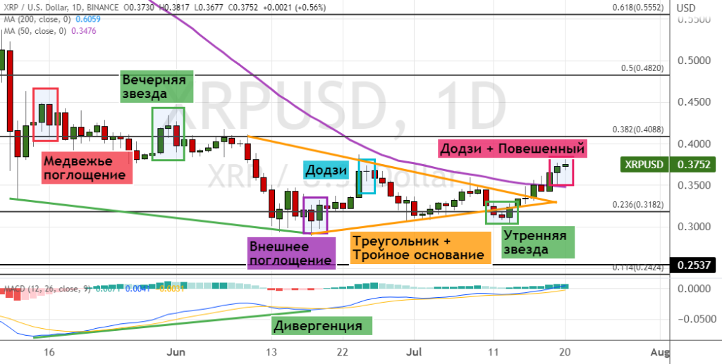 Котировки XRP после преодоления ставшего поддержкой уровня $0.35, где также проходит линия 50-дневной SMA и границы модели теханализа «Треугольника» (обозначен на графике ниже оранжевым цветом), поднялись в район текущей консолидации $0.38.
