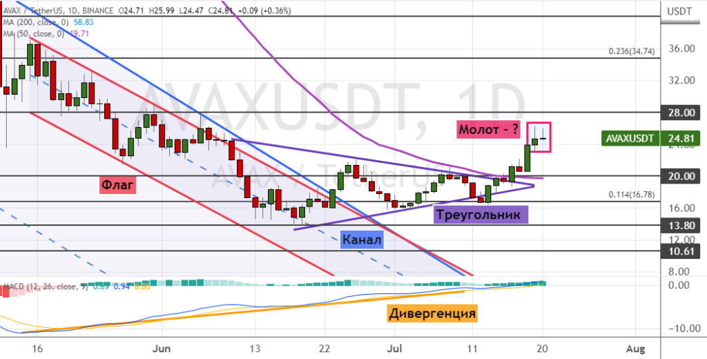 При этом уход котировок AVAX ниже уровня поддержки $20 приведет к снижению до целей $17, $15 и $13.80. В пользу сценария на понижение указывает возможное формирование двух моделей теханализа «Молот» (обозначен фиолетовым цветом).