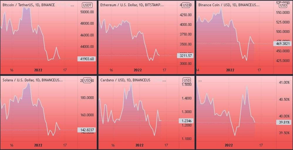Динамика котировок BTC, ETH, ADA, BNB, XRP (дневной таймфрейм) и график доминации биткоина. Источник