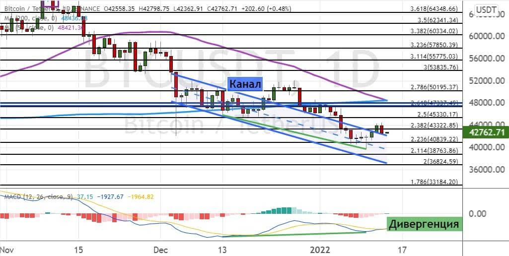 Текущие торги биткоином ведутся между поддержкой на уровне $42 000, где также проходит верхняя граница модели теханализа «Нисходящий канал» (обозначена на графике ниже синим цветом), и сопротивлением в районе $43 300.
