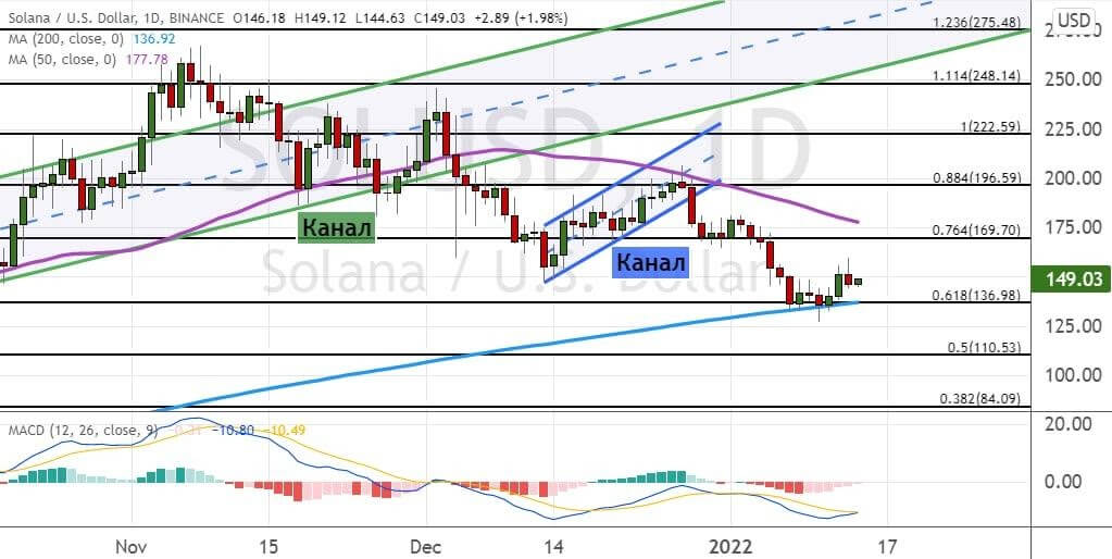 Если же быкам это все-таки удастся, то следующие уровни сопротивления для SOL будут расположены на $200 и $223, где проходит граница «Восходящего канала» (обозначена на графике ниже синим цветом). Дальнейший рост направит котировки альткоина к $250 и $270, где также проходит нижняя граница «Восходящего канала» (обозначена на графике ниже зеленым цветом).