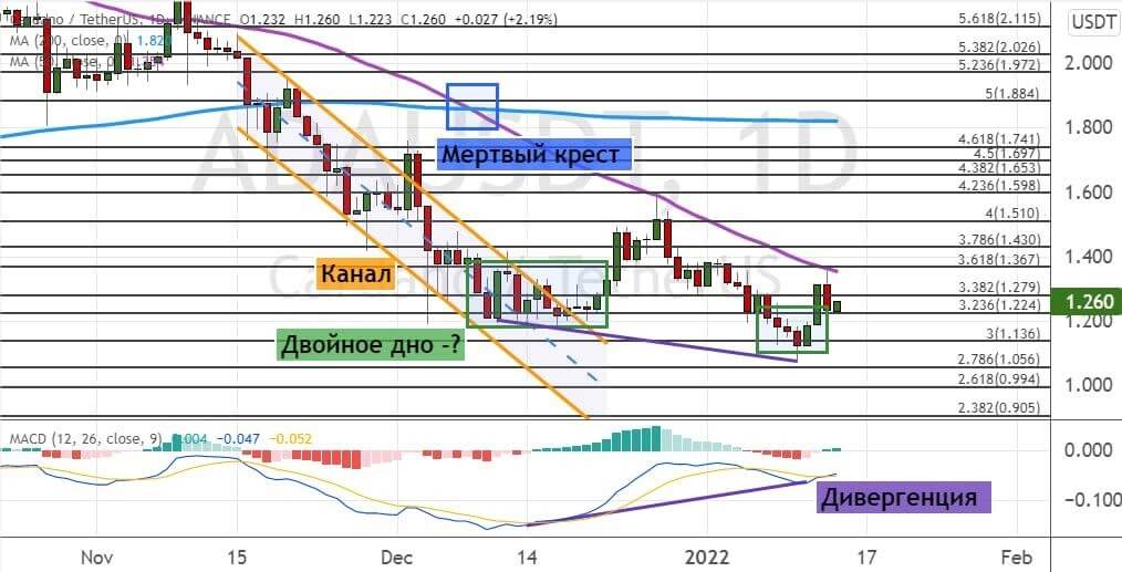 Котировки ADA торгуются между уровнями $1.22 и $1.28. Если быкам удастся преодолеть сопротивление $1.28, то далее котивроки альткоина направятся к границам  кластера уровней $1.37–$1.43, где проходит линия 50-дневной SMA. А рост выше $1.43 будет сигнализировать о начале реализации модели теханализа «Двойное дно» (показана на графике ниже зеленым цветом) и дивергенции между ценой на графике и осцилляторе MACD. В таком случае целями для быков выступят уровни $1.51, $1.6, $1.7, $1.75 и $1.80, где проходит линия 200-дневной SMA.