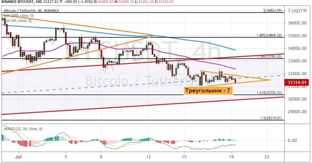 Медведи продолжают продавливать биткоин. Текущие торги проходят между уровнем поддержки $30 300 и сопротивлением на $33 200. Также котировки BTC сейчас двигаются в рамках модели теханализа «Канал». В результате на графике ниже можно отметить формирование модели теханализа «Треугольник».