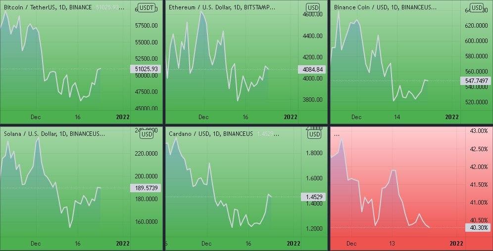 Динамика котировок BTC, ETH, ADA, BNB, XRP (дневной таймфрейм) и график доминации биткоина. Источник
