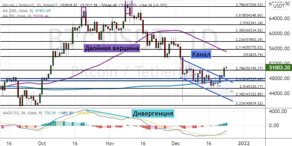 Котировки BTC вышли за верхнюю границу модели теханализа «Нисходящий канал» (обозначена на графике ниже синим цветом) и поднялись выше уровня $51 000.