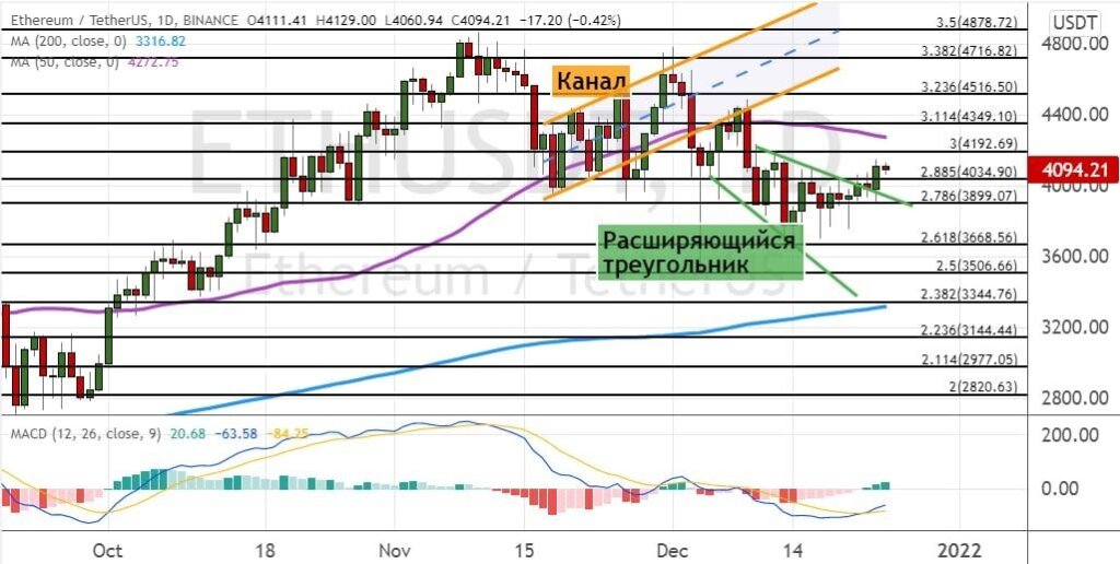 Эфир пытается закрепиться выше верхней границы модели теханализа «Расширяющийся треугольник» (обозначена на графике ниже салатовым цветом). Текущей поддержкой выступает уровень $4 050.