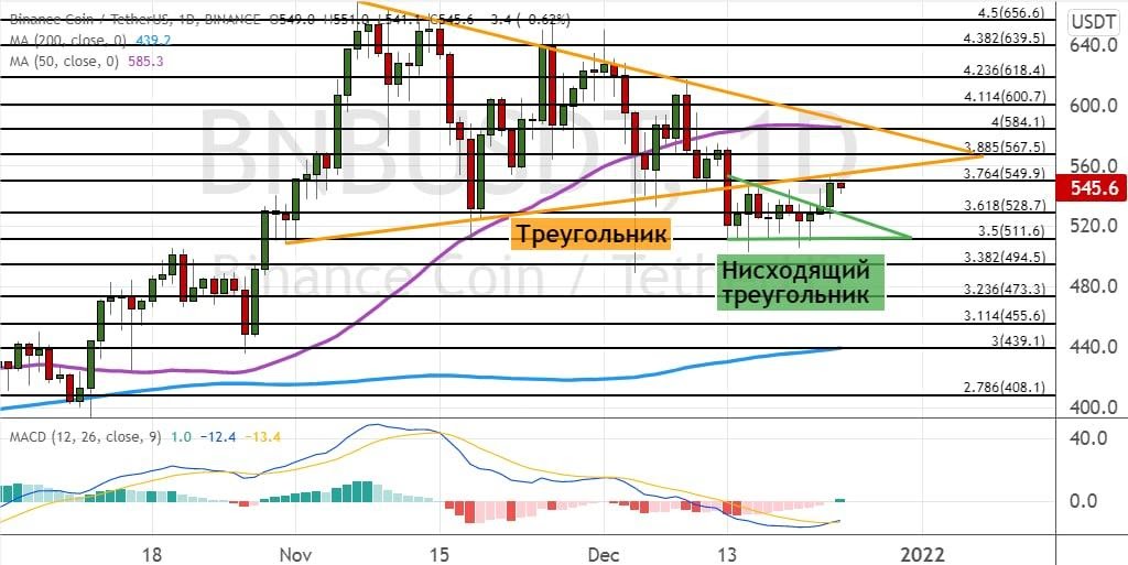 Котировки BNB вышли за верхнюю границу модели теханализа «Нисходящий треугольник» (обозначена на графике ниже салатовым цветом). Текущие торги проходят в районе сопротивления $550 и нижней границы модели теханализа «Треугольник» (обозначена на графике ниже оранжевым цветом).