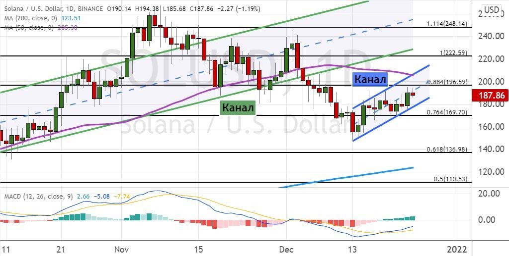 Котировки SOL отскочили от поддержки $170 и направились вверх вдоль медианы модели теханализа «Восходящий канал» (обозначена на графике ниже зеленым цветом). Текущие торги проходят ниже сопротивления — на психологически важном уровне $200, где также расположена линия 50-дневной SMA.