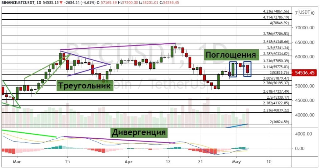Закрытие дневной свечи в районе $53 800 станет сигналом о формировании свечной комбинации «Медвежье поглощение» (представлена на графике ниже). Это может направить котировки BTC вниз к поддержкам $51 900 и $50 200. А более серьезная коррекция может опустить стоимость биткоина до $47 400, $45 300 и $43 300. Но столь глубокое снижение представляется маловероятным сценарием развития торгов.