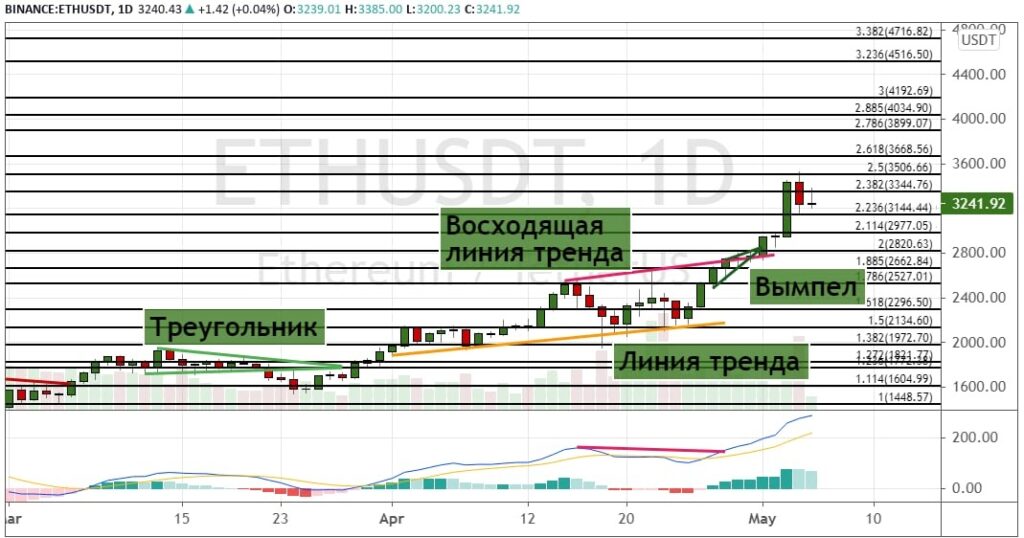 Как мы писали выше, эфир продолжает обновлять ценовые максимумы в рамках долгосрочного восходящего тренда.