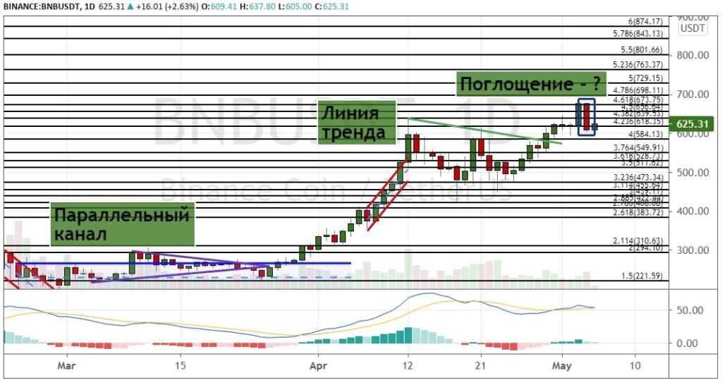 Котировки BNB начали откатываться назад после стремительного взлета до первых целей $640, 655, $670. Это привело к формированию свечной комбинации «Медвежье поглощение», что может указывать на то, что сейчас медведи набирают силы.