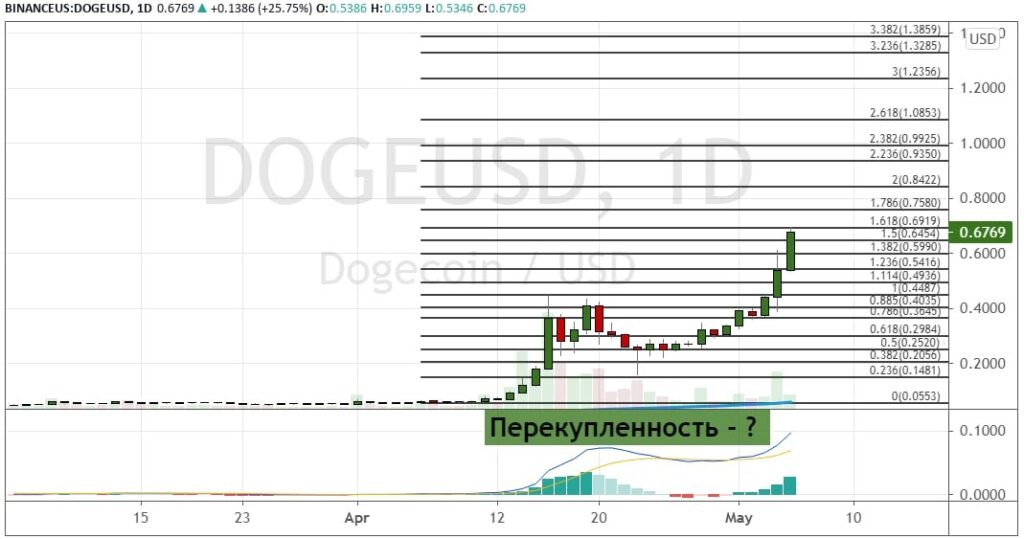 Но стоит также отметить, что цена DOGE на осцилляторе MACD находится в зоне «перекупленности». Это указывает на риск краткосрочной коррекции, но среднесрочный тренд на рост это не должно переломить. Поддержками вновь выступят уровни $0.6, $0.5, $0.45 и $0.4.