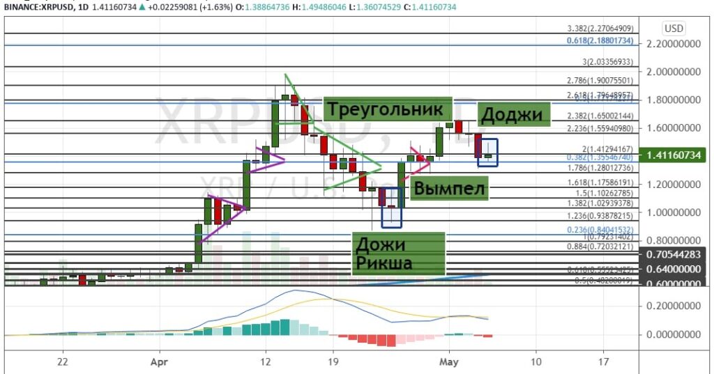 После ретеста уровней сопротивления $1.56 и $1.65 XRP пошел вниз, но приостановил свое снижение в районе горизонтальной консолидации $1.28 – $1.41.