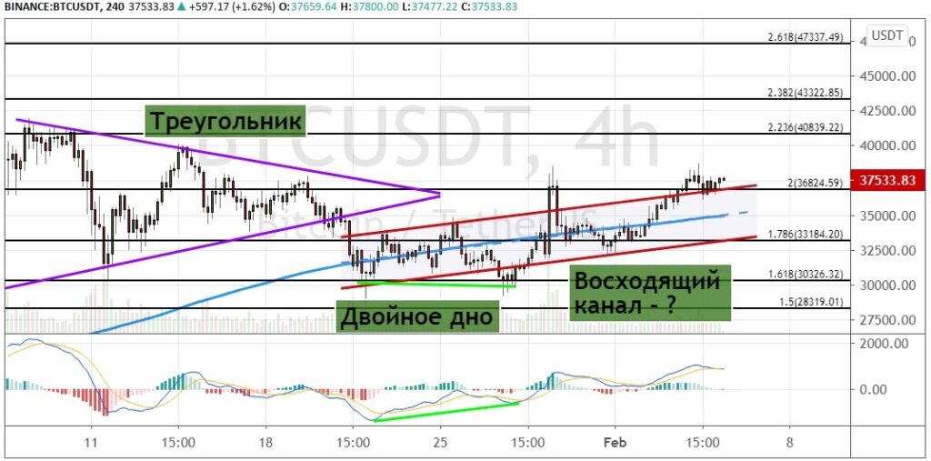 Важный уровень сопротивления на $36 824, где также проходит верхняя граница модели теханализа «Восходящий канал», был успешно преодолен. В краткосрочной перспективе рост капитализации крипторынка может привести к тому, что биткоин в ближайшее время достигнет первых целей в виде сопротивлений на области $40 000 – $40 840 и далее — к $43 320. Этот тренд является продолжением бычьей дивергенции между ценой на графике и осцилляторе MACD, а также проходит в рамках реализации модели теханализа «Двойное основание (дно)». В среднесрочной перспективе предстоящих месяцев биткоин может устремиться к сопротивлениям $47 337 и $50 000.