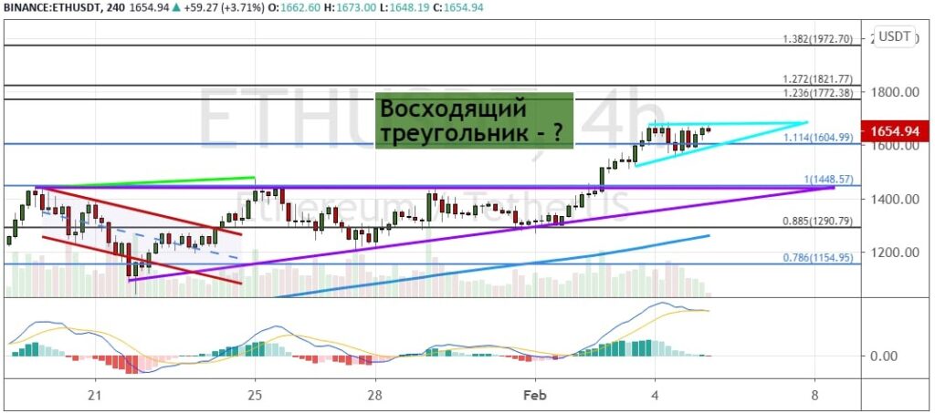 Эфир после преодоления верхней границы бычьей модели теханализа «Восходящий треугольник» и области сопротивления $1 400 – $1 450 устремился к сопротивлению $1 600. Пока уверенно закрепиться выше этого уровня котировкам ETH не удается. Это привело тому, что на графике альткоина сформировался новый «Восходящий треугольник».