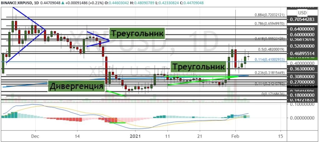 Рипл на фоне включения в сервис кредитования от компании SBI Holdings после ретеста поддержки $0,3630 начал реализацию бычьего сценария, что привело к тестированию первых целей на сопротивлениях в виде областей $0.40 – $0.41 (11,4% коррекция по уровням Фибоначчи) и $0.4690 – $0.4820 (50% коррекция по Фибоначчи). Сохранение импульса позволит XRP в краткосрочной перспективе достичь сопротивления $0.52 и $0.55. Среднесрочные цели на сопротивлениях $0.64, $0.66, области $0.70 – $0.72 и $0.80 могут быть достигнуты уже в предстоящие месяцы.