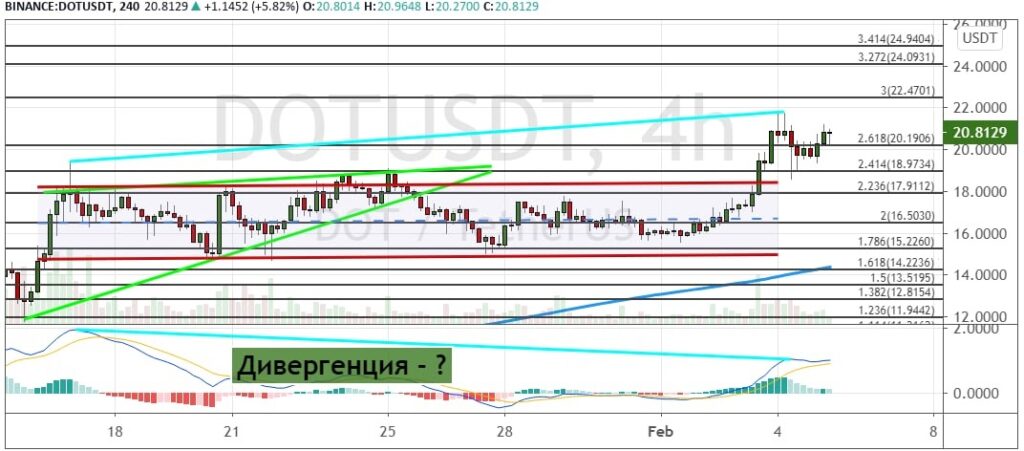 Котировки DOT пробили сопротивление на уровне $18 (23.6% расширение по уровням Фибоначчи), где располагается верхняя граница модели теханализа «Флаг». Это привело к достижению целей на отметках $19 и $20.20. Сохранение импульса на рост позволит DOT достичь краткосрочных целей, расположенных на уровнях сопротивлений $20.50, $22.50, $24 и $25, сформированных на основе расширений пропорции Фибоначчи.