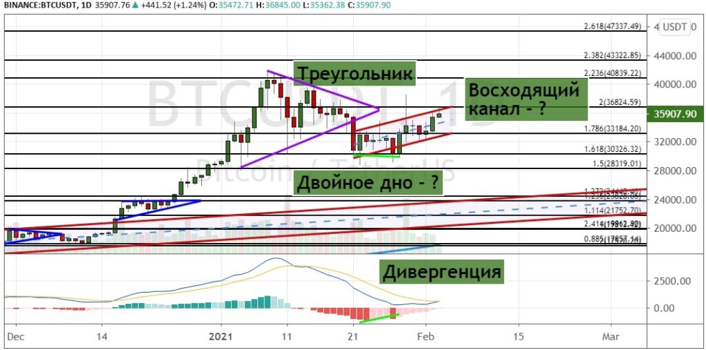 С понедельника биткоин продолжает движение по восходящему тренду, что привело к повторному тестированию первой цели на уровне $36 824, где также проходит верхняя граница модель теханализа «Восходящий канал».