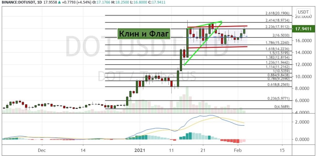 Котировки DOT уверенно достигли первой цели в виде уровня $18 (23.6% расширение по уровням Фибоначчи), где проходит верхняя граница модели теханализа «Флаг». Прорыв приведет к росту до среднесрочных целей на отметках $19, $20.20, $20.50 и $25.