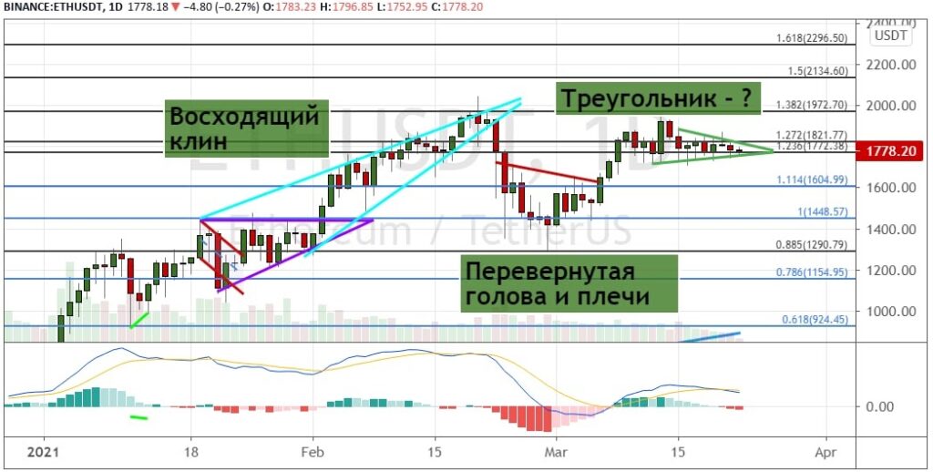 Эфир продолжает консолидацию в рамках области $1 772 – $1 820. В то же время котировки ETH завершают формирование модели теханализа «Треугольник». В случае если стоимость ETH пойдет вниз, могут быть протестированы поддержки на $1 600 (11.4% расширение по уровням пропорции Фибоначчи) и на $1 400 – $1 450.