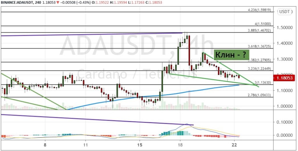 ADA продолжает демонстрировать нисходящее движение после пробития уровней $1.2250 и $1.2790. Это движение прошло в рамках приведенной на графике ниже модели теханализа «Клин». Более глубокая коррекция может привести к снижению до $1.1360, где проходит линия 200-дневная SMA. В пользу этого указывает дивергенция между ценой и осциллятором MACD. Сохранение нисходящего импульса позволит ADA протестировать область $1.00 – $1.05.