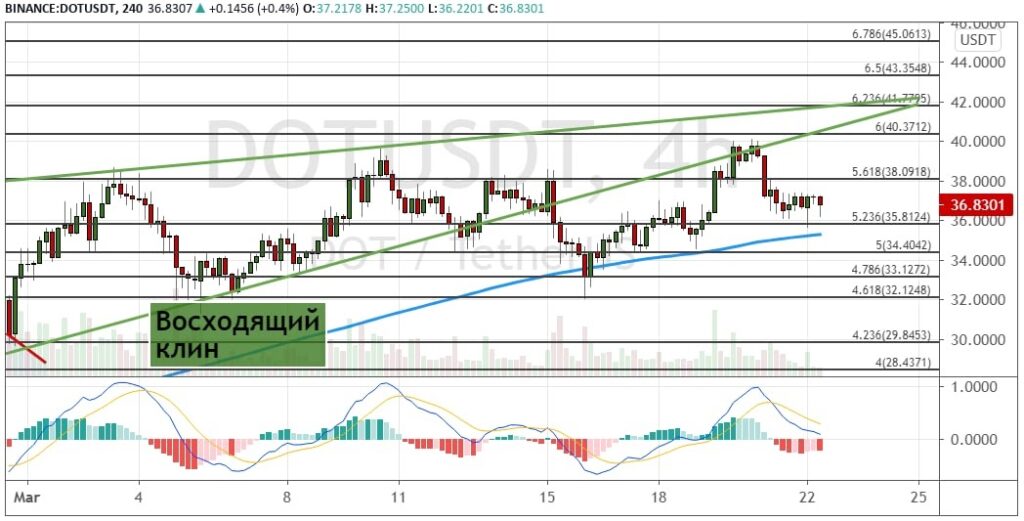 Котировки DOT произвели абсолютно верный с точки зрения теханализа ретест приведенной ниже модели «Восходящий клин». Это позволило альткоину вновь проверить на устойчивость уровни $38 и $40, а также привело к тому, что DOT опустился до уровня поддержки на $35.80, где расположилась линия 200-дневной SMA. Сохранение нисходящего импульса позволит проверить на устойчивость уровни $34.40, $33.10 и $32.