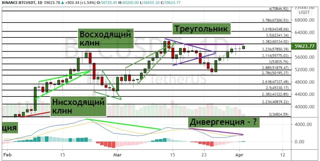 Поддержкой для текущих котировок биткоина выступает уровень $57 900. Медвежья дивергенция между ценой на графике и осцилляторе MACD может стать причиной, по которой биткоин уйдет в коррекцию и пробьет текущую поддержку. В таком случае медведи протестируют поддержки $53 800 и $55 800, а более глубокое снижение опустит стоимость биткоина до границ области $51 900 – $52 000 и уровня $50 200.