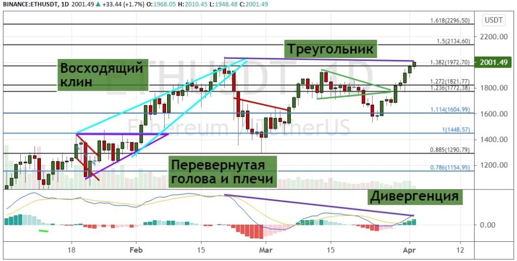 Эфир успешно преодолел важный уровень сопротивления $2 000 и достиг своего исторического максимума на отметке $2 008. Сохранение импульса на рост позволит стоимости ETH устремиться к среднесрочным целям $2 130 и $2 300, рассчитанным по расширениям по уровням пропорции Фибоначчи.