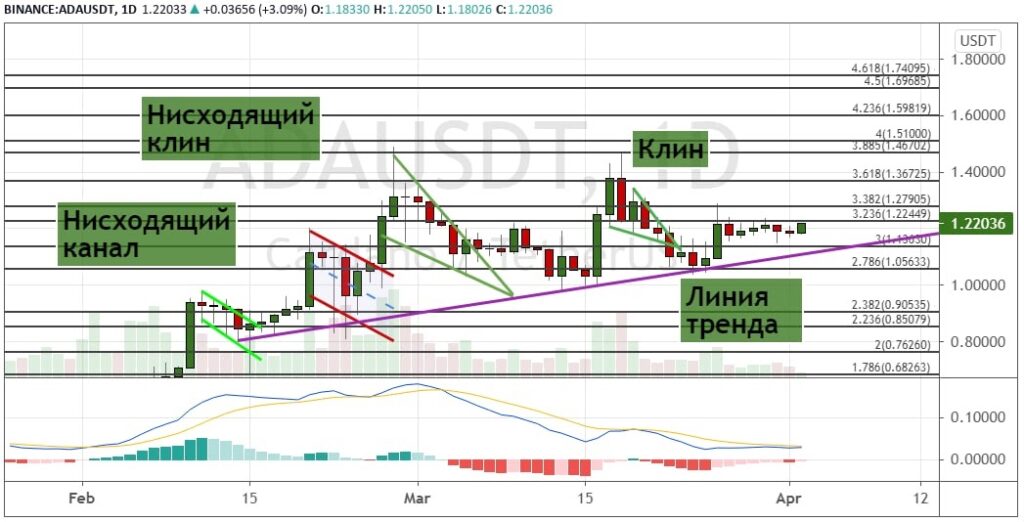 ADA продолжает расти вдоль восходящей линии тренда (представлена на графике ниже) и снова пытается пробить уровень $1.2250. В случае успеха это позволит котировкам ADA устремиться к первой цели $1.2790 и уровням $1.3680, $1.4670, $1.51, $1.60. В среднесрочной перспективе альткоин отправится вверх к границам области $1.70 – $1.74.