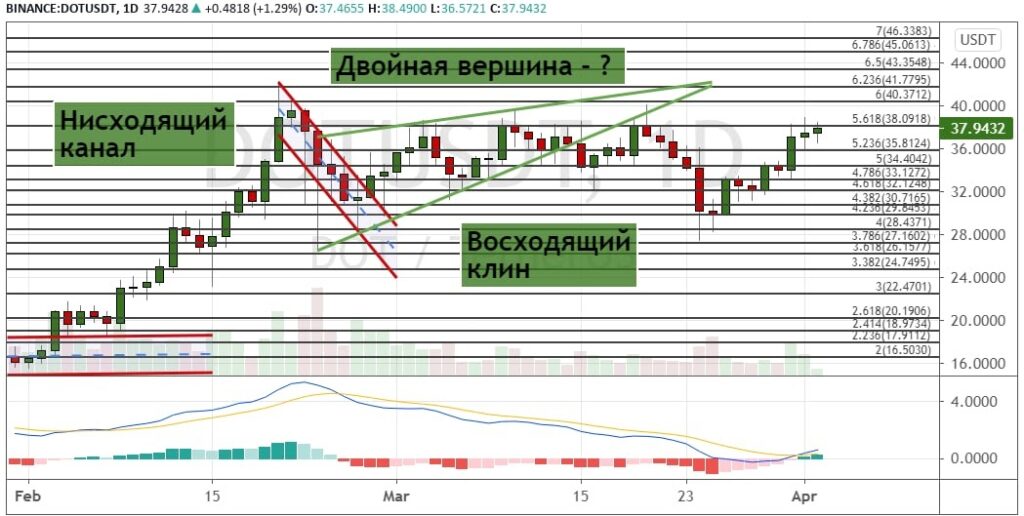 Котировки DOT вместе с другими альткоинами демонстируют рост, что позволило активу пробить сопротивления $34.40 и $35.80. А после этого DOT уверенно достиг уровня $38, где и проходят текущие торги.