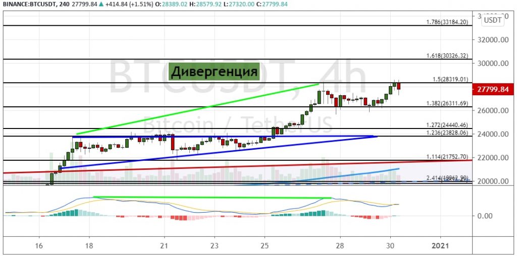 Однако в перспективе стоит ожидать преодоления линии сопротивления $28 319 и роста к целям $30 326 и $33 180, которые рассчитаны на основе расширений Фибоначчи. Важный вопрос, который будет будоражить умы криптотрейдеров до конца 2020 года — сможет ли биткоин достичь $30 000? Или же это историческое событие произойдет уже в следующем 2021 году?